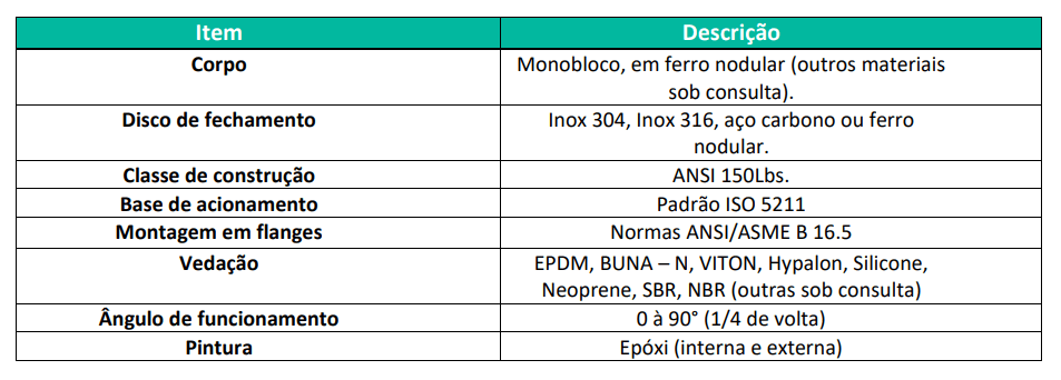 Contando com um corpo em ferro nodular, pintura epóxi interna e externa, corpo da borboleta disponível em vários materiais, e diferentes tipos de vedação, as válvulas borboleta da GBI Brasil estão preparadas para atender a demanda de nossos clientes com qualidade, precisão e satisfação.
